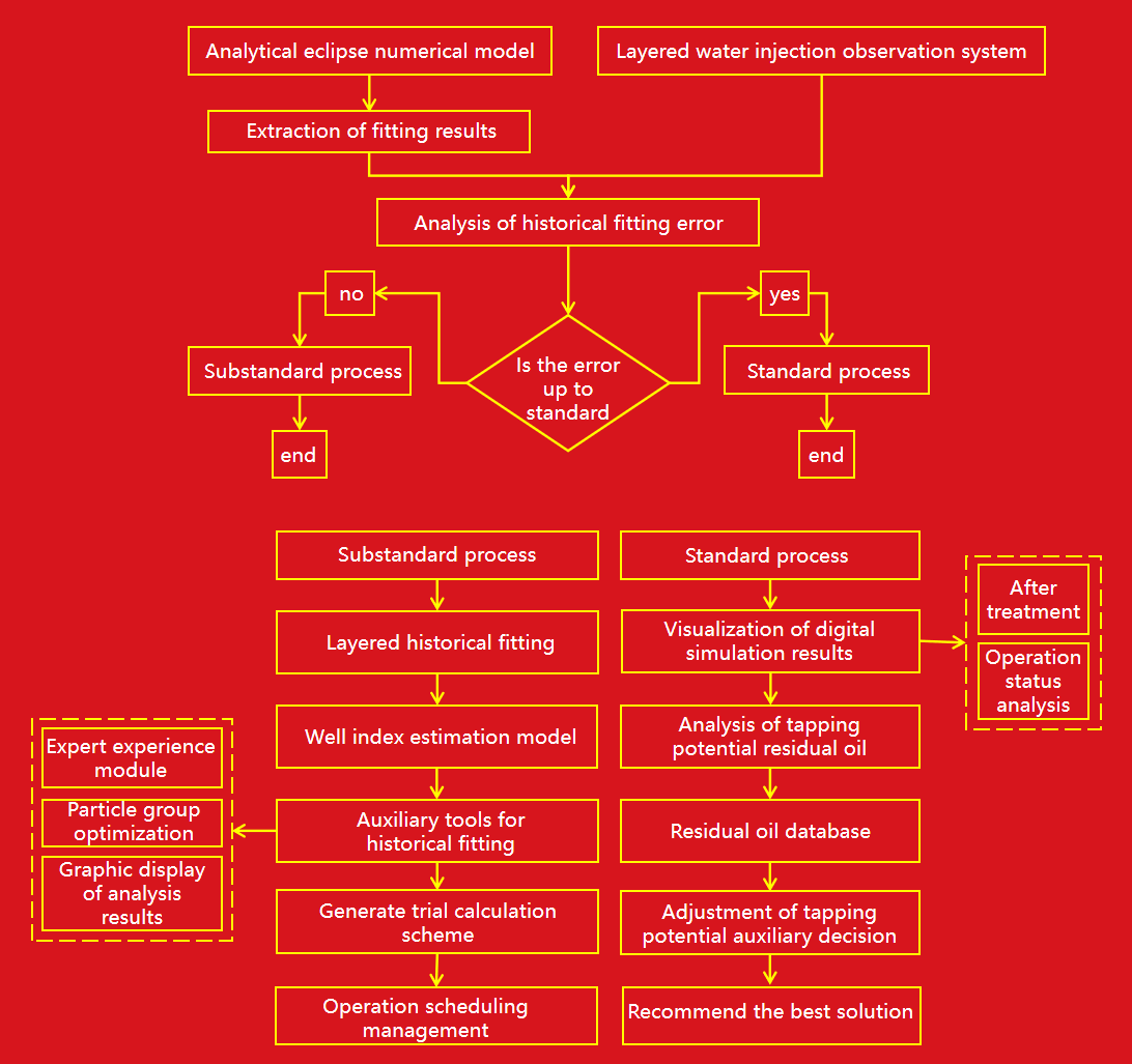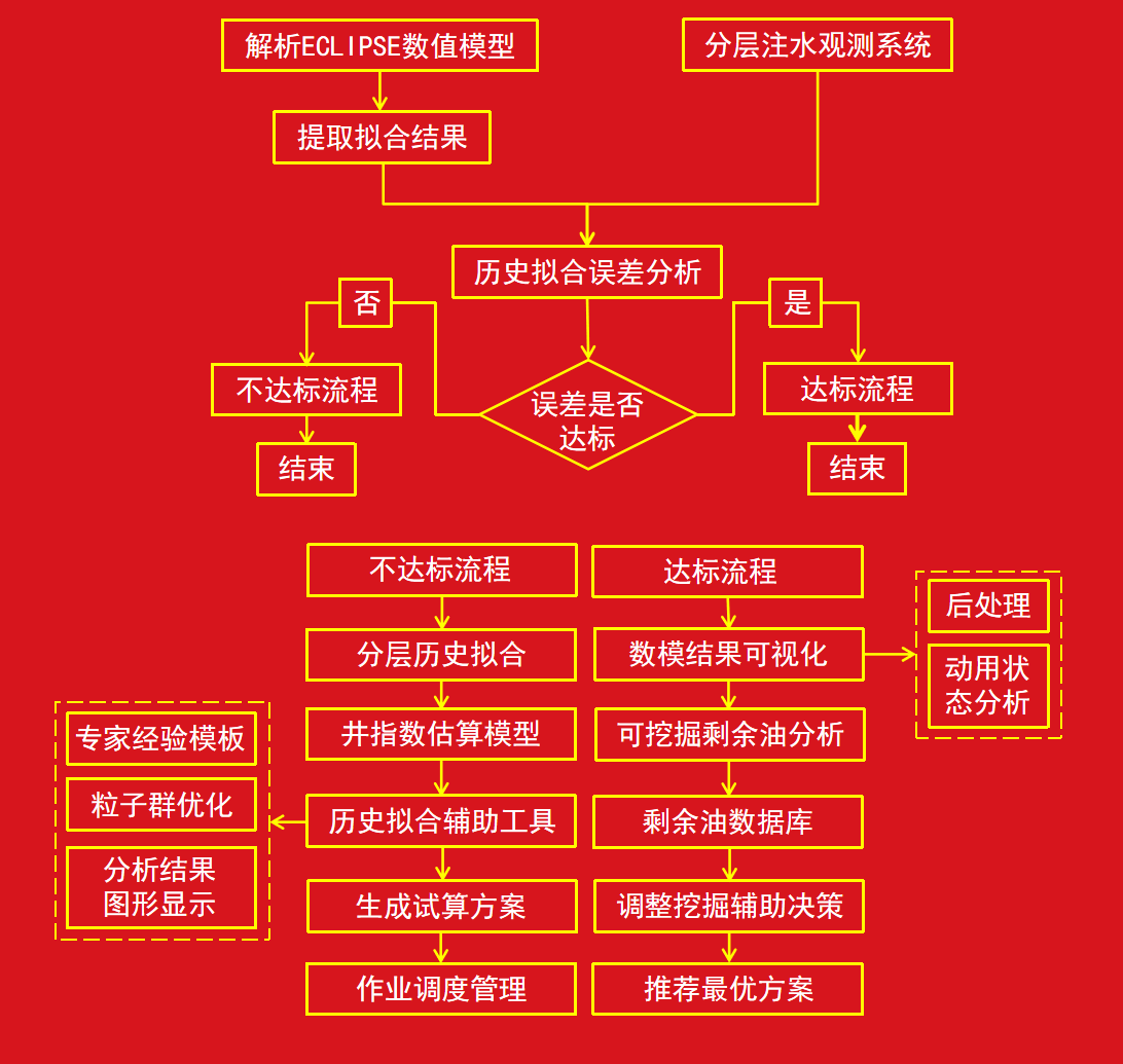 确定研发模拟成果分类存储、历史拟合误差分析、分层历史拟合、历史拟合辅助工具、作业调度管理、后处理、动用状况分析、可挖潜剩余油分析和调整挖潜辅助决策9个模块。